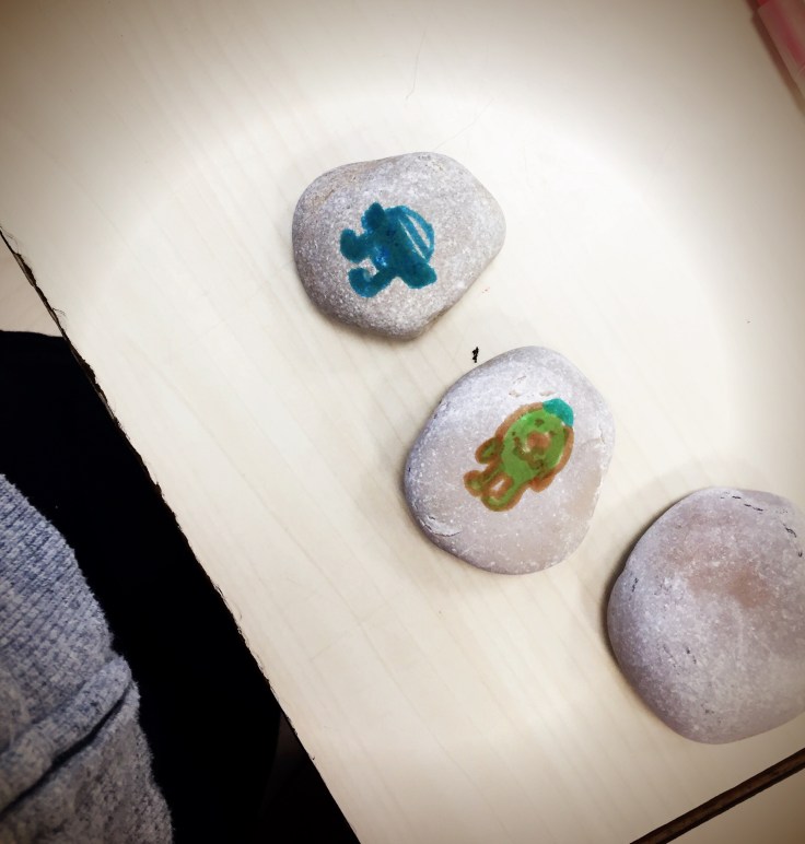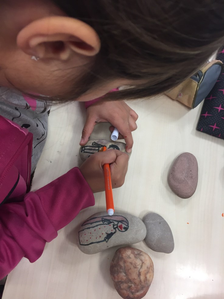 En el segundo día de talleres hemos pintado piedras para contar historias. Las piedras representan dibujos de personajes, lugar y objetos con los que luego podremos contar cuentos e inventarnos historias. Además podemos cambiar las piedras con los compañeros y así crear historias nuevas. Aunque es una tarea difícil para niños de 6 años, la verdad es que ha quedado bastante bien.