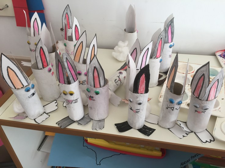 También hemos hecho una marioneta de Easter Bunny con un rollo de cartón. ¡Nos han quedado tán chulos!