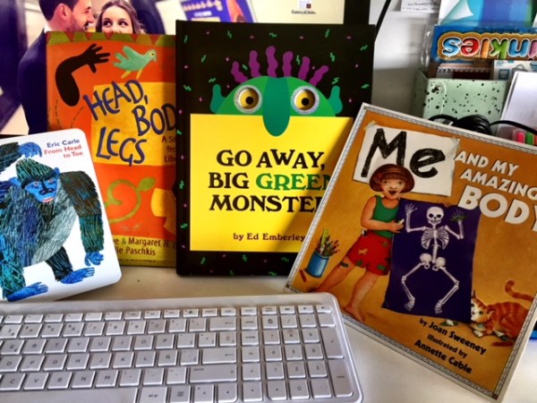 From Head to toe no necesitamucha presentación, su archiconocido escritor Eric Carle (The very hungry caterpillar, Brown bear, Brown bear what do you see?…)  es sinónimo de éxito entre los niños por sus ilustraciones chulas y la sencillez de sus textos. El libro trata el vocabulario más básico de las partes del cuerpo: head, neck, shoulders, arms, hands, chest, back, hips, knees, legs, foot and toe. Me encanta porque además, lo hace utilizand diferentes animales y acciones, así que matas 3 pájaros de un tiro!jeje
